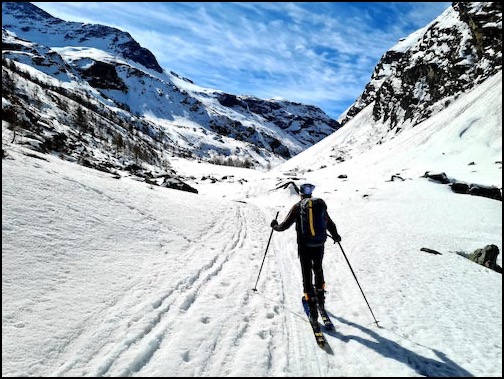 Olivier, Bertrand, Christophe, Jean-Christophe. Avec la fine équipe de l'an dernier nous avions prévu trois jours en étoile autour de Saint-Véran. Mais, patatras, cette année, l'enneigement particulièrement médiocre nous a vivement incité à changer de plan. Ce sera donc le Valgrisenche, autour du refuge Marion Bezzi, si chaleureux et agréable. Au moins là, nous aurons de la neige. Dure certes, et sans renouvellement aucun depuis des semaines, car le ciel est désespérément bleu, mais de la neige. Depuis Menthieu la montée en refuge est plutôt plate, et un peu longue. Olivier s'inquiète d'une douleur à une malléole et, en s'arrêtant pour y remédier, s'aperçoit… qu'il avait tout simplement inversé les chaussons droit et gauche de ses chaussures ! Bon, comme quoi ça arrive plus facilement qu'on ne le croit. Le problème c'est que cette douleur est installée et qu'en cherchant à l'éviter il se fabrique une méga-ampoule qui lui gâchera tout le plaisir de ces trois jours. Et comme il ne veut pas gâcher le plaisir de ses compagnons il va endurer. Et, lui qui est habituellement si gai en ces circonstances, se concentrer dans un seul but : tenir.